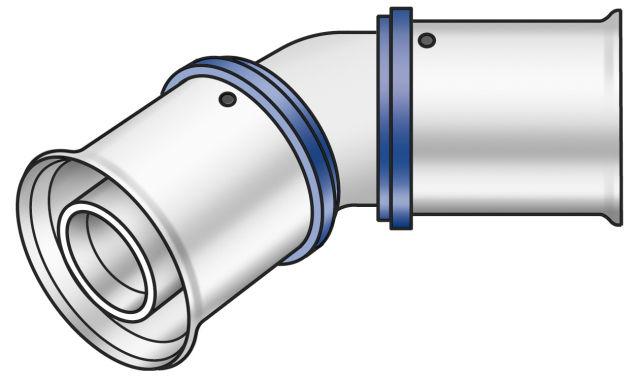 Press-Winkel 45° für Richtungsänderung mit minimalem Radius, aus Messing porenfrei metallisiert, inkl. Stützhülsen mit O-Ringen und Stahl bzw. Edelstahl-Presshülsen, "unverpresst undicht"